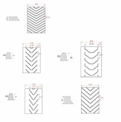- Chevron shape, cleat shape, U shape, herringbone shape, cylinder pattern